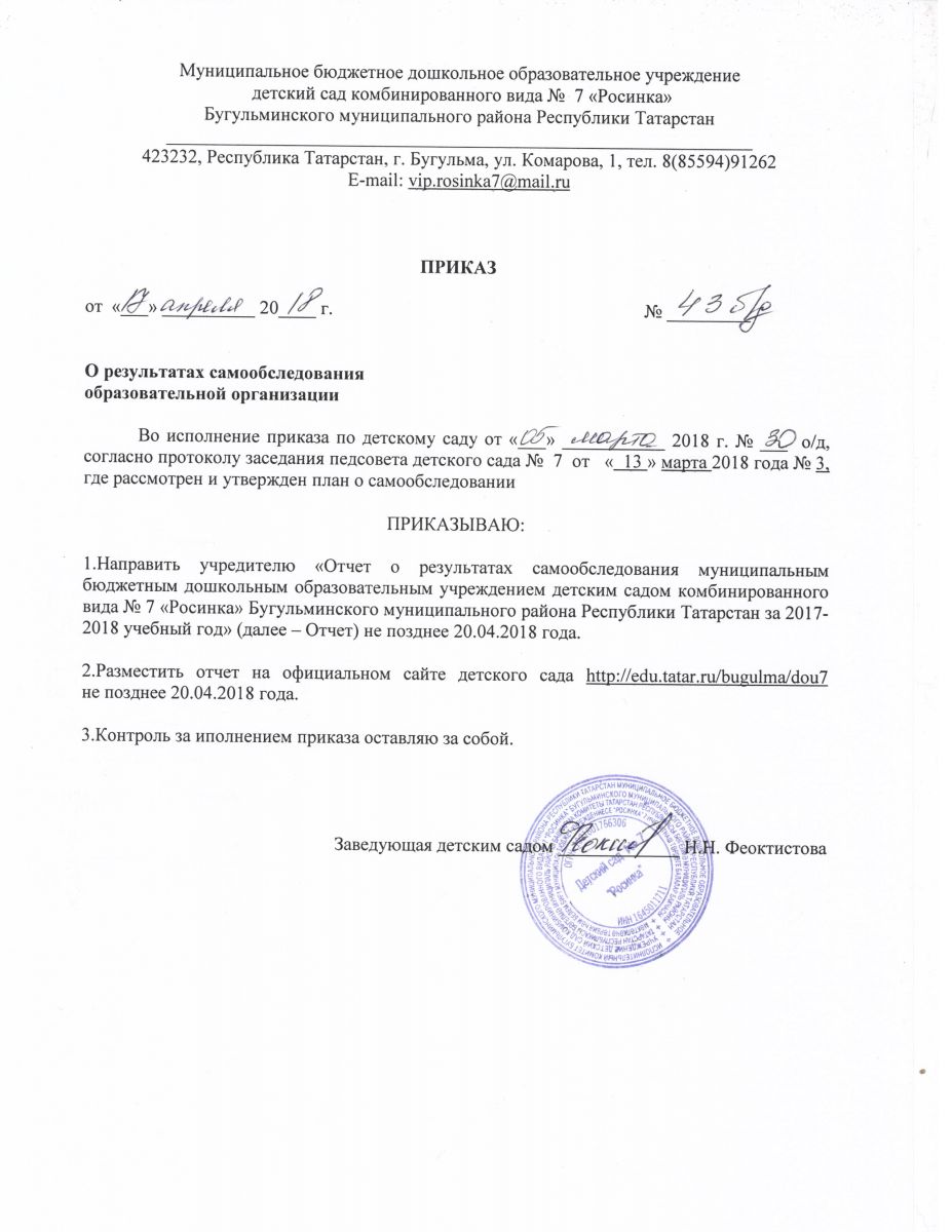 Приказ о результатах самообследования образовательной организации за 2017 г.
