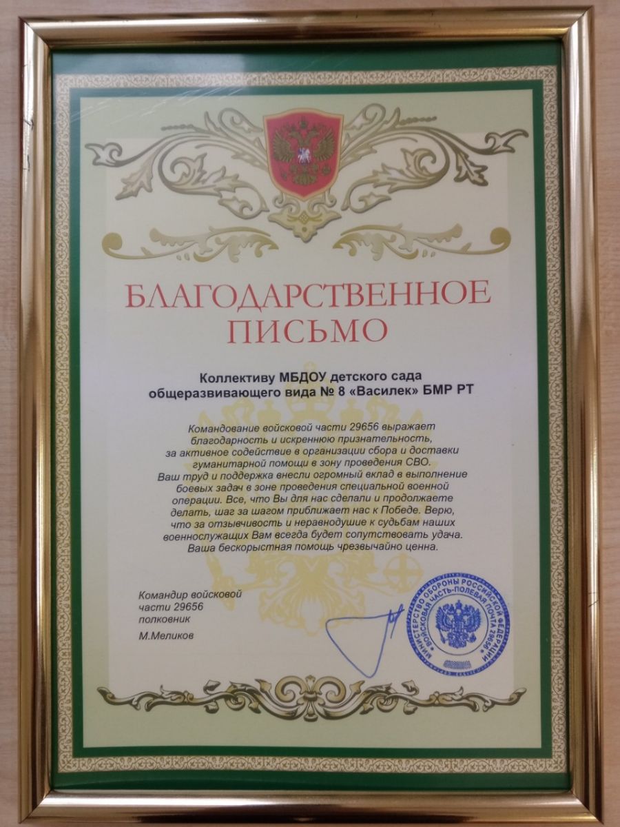 Командование войсковой части 29656 выражает огромную благодарность и искреннюю признательность всему нашему детскому саду (сотрудникам, родителям наших воспитанников) за активное содействие в организации сбора и доставки гуманитарной помощи в зону проведения СВО. Далее... -