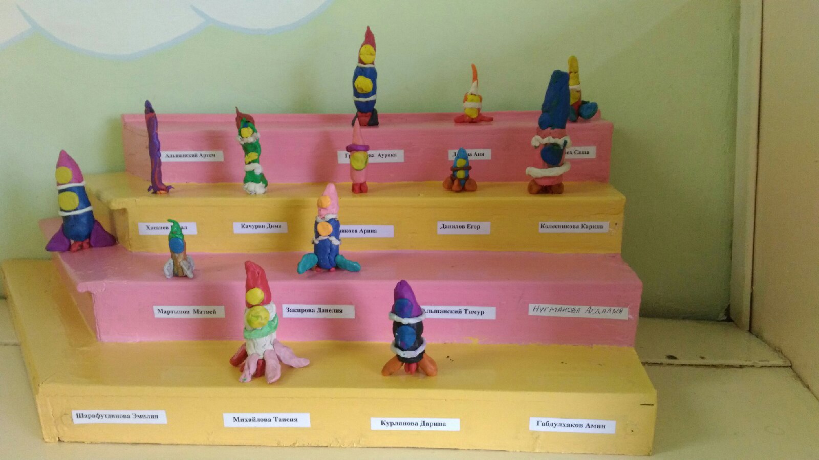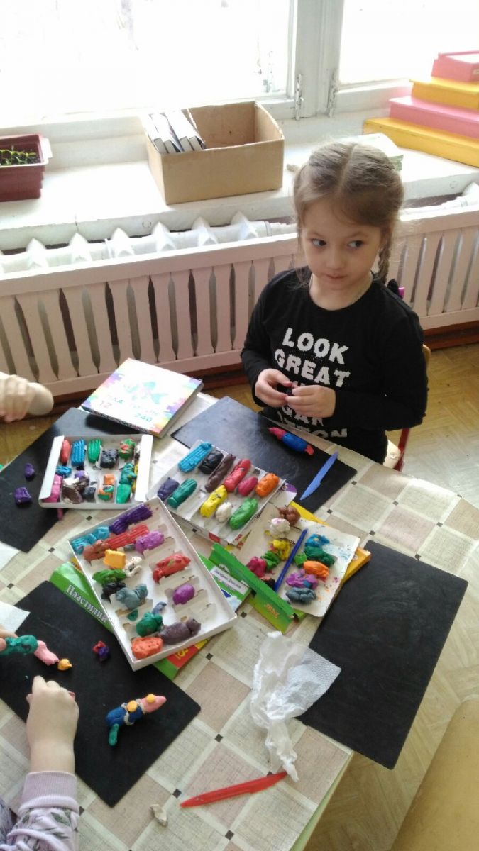 На занятии по лепке ребята узнали о космическом корабле. Рассмотрели образцы ракет на выставке и добавили свои экспонаты.