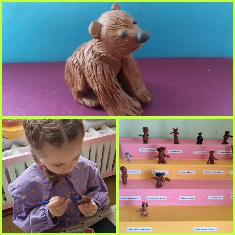В продолжении недели "Неделя детской книги" дети рассматривали книги со сказками. Вспомнили сказки, где герой — медведь. На занятии по лепке ребята вылепили "Косматого мишку", создавая имитацию меха стекой. (Смотреть видео!)