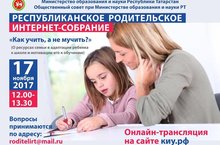 "Министерство образования и науки Республики Татарстан совместно с Общественным советом при МОиН РТ запускают новый проект для родителей "Республиканское родительское интернет-собрание. Как учить, а не мучить?" по актуальным вопросам воспитания. Подключайтесь, задавайте свои вопросы специалистам по адресу roditelirt@mail.ru. Он-лайн трансляция на сайте киу.рф 17 ноября 2017 года с 12.00 до 13.30."