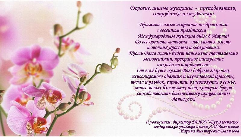 6 марта, в канун замечательного праздника весны, любви и красоты в училище состоялся праздничный концерт «Первое дыхание весны». С Международным женским днем поздравила директор училища Марина Викторовна Данилова, она поблагодарила женский коллектив за теплоту сердец, мудрость и доброту.