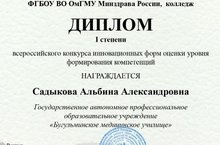 На базе колледжа ФГБОУ ВО «ОмГМУ» Минздрава РФ состоялся Всероссийский конкурс учебно-методических материалов, обеспечивающих использование в образовательном процессе инновационных форм оценки уровня формирования компетенций. В конкурсе, который проводился дистанционно, участвовали преподаватели средних профессиональных образовательных организаций России. Методист училища Садыкова А.А.представила рабочую тетрадь по дисциплине «Проектная деятельность», которая получила высокую оценку жюри и заняла 1 место.