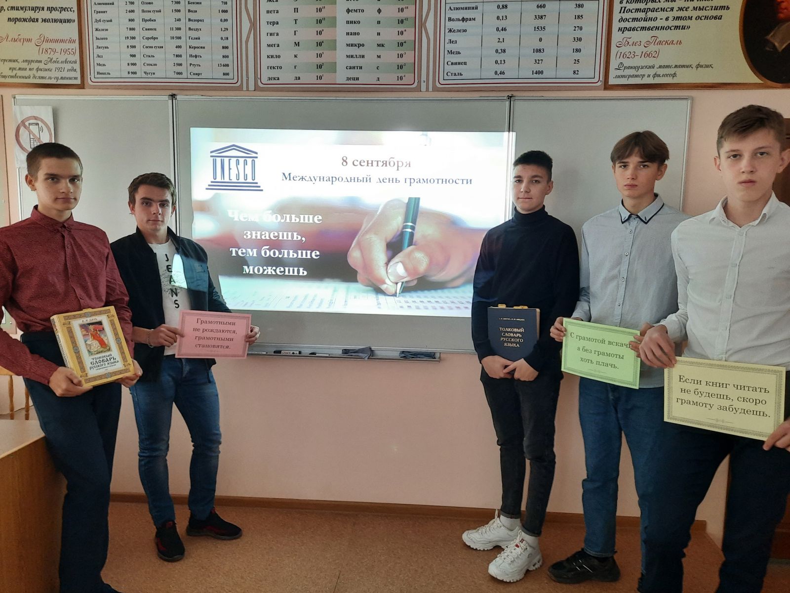 8 сентября в мире традиционно отмечается Международный день грамотности. Классный час под девизом «Чем больше знаешь, тем больше можешь» прошёл в группе № 605 обучающихся II курса по профессии «Машинист на буровых установках» (классный руководитель Ильина И.И.). Мероприятие направлено на привлечение внимания обучающихся к состоянию собственной грамотности.