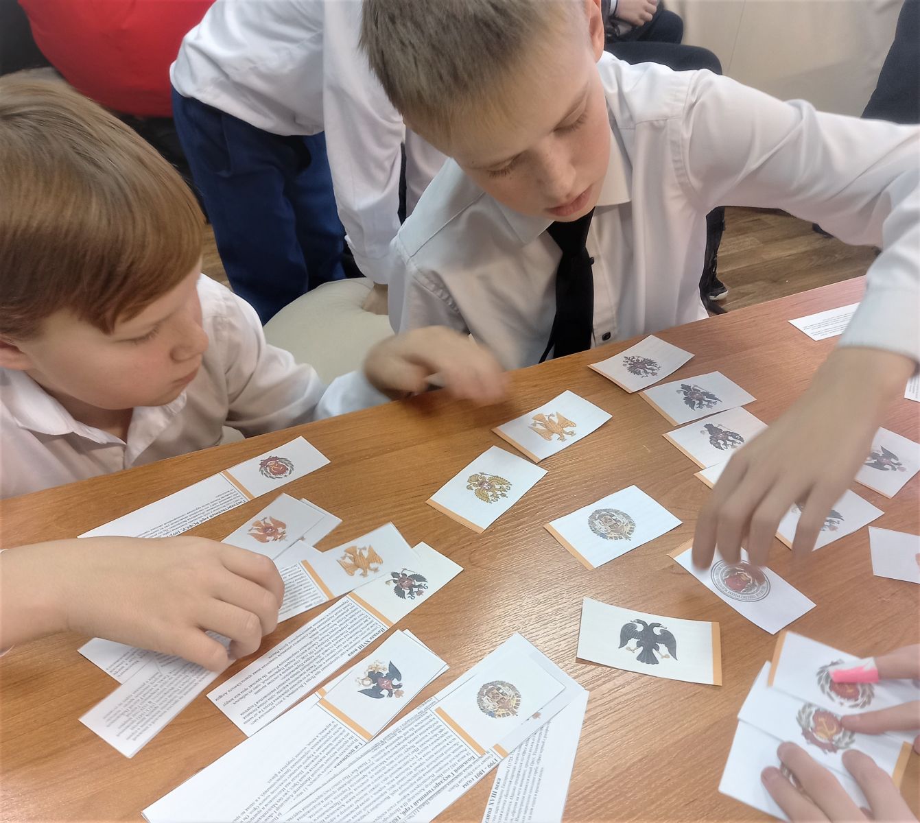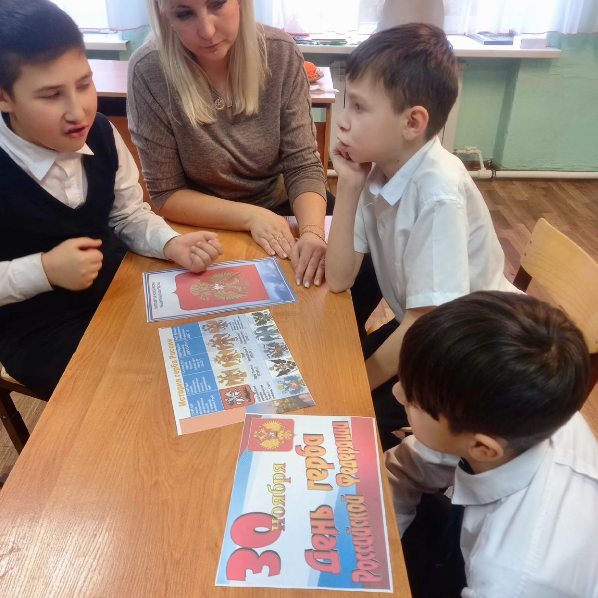 В нашей школе - интернате в 6 и 8 классах советником директора по воспитанию проведена игра: "История российского герба", которая проходила в Центре детских Инициатив. Обучающиеся искали парные карточки с изображением герба, знакомились с историей российской государственности. Особая атрибутика, которая отличает страну от других государств, подчеркивает независимость и историческую самобытность нации, называется державной символикой и включает в себя гимн, флаг и официальный знак. 30 ноября 2023 года исполняется 30 лет со дня утверждения Государственного герба Российской Федерации. Цветовое значение на гербе является немаловажной частью символики. Каждый цвет в геральдике имеет особое значение: красный – цвет храбрости, мужества, отваги, пролитой крови защитниками Родины; золотой – богатство во всех смыслах: материальные, природные достояния, духовные ценности; синий – небо, свобода, верность, честь; - белый – чистота, благородство.