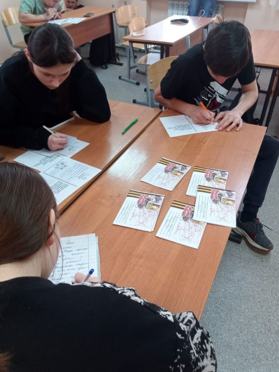 В нашей школе прошла замечательная акция, приуроченная ко Дню Великой Победы, в рамках недели психологии. Обучающиеся 9 класса совместно с воспитателем Старчеусовой Н.Н. написали письма участникам специальной военной операции, выражая свою благодарность и поддержку. В своих посланиях ребята делились своими мыслями о мире, мужестве и значении победы.