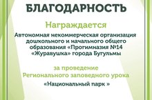 24.02.2017 года директором ЭкоЦентра "Заповедники" Н.Р. Данилиной была вручена Благодарность АНО "Прогимназия №14" за проведение Регионального заповедного урока "Национальный парк".