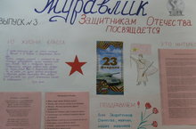В канун 23 февраля ученицами 4 класса была выпущена очередная газета «Журавушка» №3, в которой была информация о возникновении праздника Дня Защитника Отечества, опубликованы лучшие стихи, пословицы о Родине и конечно же слова поздравления будущим защитникам Родины. С праздником, дорогие мальчики!!!