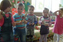 Наши малыши охотно играют со шнуровками, с домиками – проталкивателями, пирамидками, конструкторами, крупной мозаикой, также составляют композиции из плоскостных геометрических фигур, ещё лепят из пластилина, рисуют кистью, пальчиками, ладошкой. А ещё им очень нравится лепить из солёного теста: «Угощение для любимого Дружка», «Зёрнышки для курочки с цыплятами».