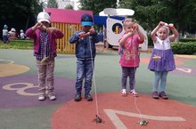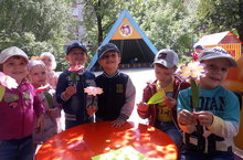 День для ребят начался с веселой зарядки "Ласковое солнышко". Солнышку были посвящены и веселый интеллектуальный батл, и игра-эксперимент «Солнечные зайчики» с созданием на стене целых солнечных сюжетов, и подвижные игры с солнечными зайчиками. Старшие девочки провели мастер-класс для ребят по изготовлению игрушки для дыхательной гимнастики "Солнышко" с лучиками из полиэтиленовых пакетов. Ребята играли с солнышком в театр теней, рисовали его на песке, составляли солнышко из кубиков, малыши с удовольствием изготовили из бумаги способом обрывания лучи для солнца, украшали солнышко лучиками –прищепками. Ребята средней группы решили сами стать частью солнышка в творческой композиции. И, конечно же, все с наслаждением принимали солнечные ванны.