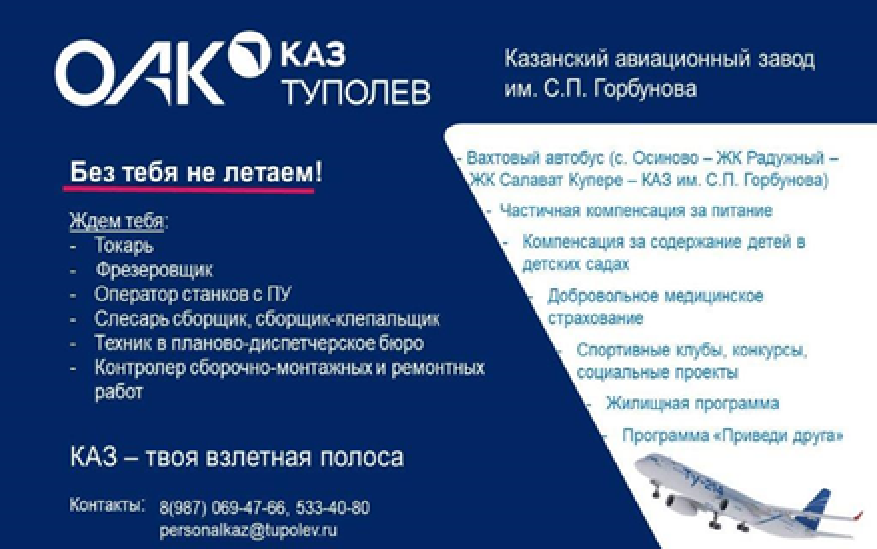 Предприятие гарантирует работникам добровольное медицинское страхование и все социальные льготы и гарантии, предусмотренные трудовым кодексом. Резюме направлять по электронному адресу: bmzvakansii@yandex.ru За дополнительной информацией обращаться в отдел управления персоналом БМЗ ПАО «Татнефть», тел.:7-60-37. ( от 17.03.20222)