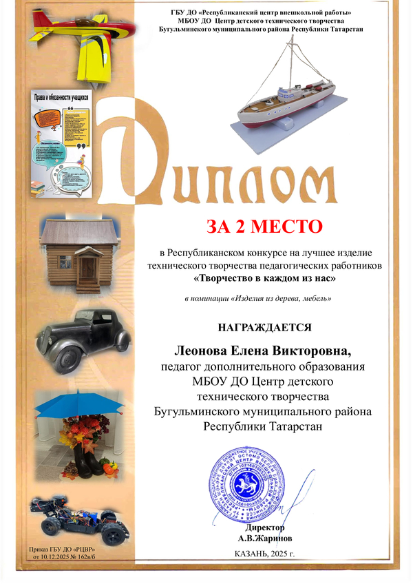 23. Республиканский конкурс на лучшее изделие технического творчества педагогических работников "Творчество в каждом из нас" Диплом 1 место Диплом 2 место Диплом 2 место Диплом 3 место Диплом за творческий подход Диплом за творческий подход Диплом за творческий подход Сертификат