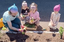 Наши девочки сегодня помогали своему воспитателю высадить рассаду цветов на клумбы. Саженцы рассады девочки осторожно поместили в углубление в земле, засыпали лунки землёй и уплотнили почву.