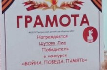 Поздравляем Шутову Лию с ПОБЕДОЙ в конкурсе "Война.Победа.Память". Уверены, что впереди нашу Лию ждут новые вершины, и она обязательно их достигнет.