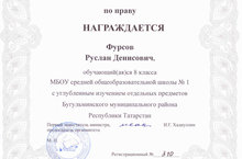 17 января 2020 года в Казани прошел республиканский этап предметной олимпиады по праву. На этой олимпиаде из Бугульмы принял участие победитель муниципального этапа, ученик 8а класса МБОУ СОШ №1, Фурсов Руслан. Он показал хорошие знания по предмету и стал призером (учитель Абарова Венера Фаруковна). Молодец, Руслан!