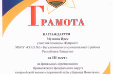 Учащиеся МБОУ СОШ №1 Музипов Ирек, Павлов Виталий и Шаркаев Айдар в составе сборной команды города Бугульмы «Патриот» приняли участие в финальных соревнованиях Приволжского федерального округа юнармейской военно-спортивной игры «Зарница Поволжья». В этих соревнованиях всероссийского значения команда юнармейцев города Бугульмы заняла 5 командное место. Отличные результаты показал ученик 8а класса Музипов Ирек: дважды он стал призером в личном зачете и привез домой две грамоты. Молодцы, ребята!