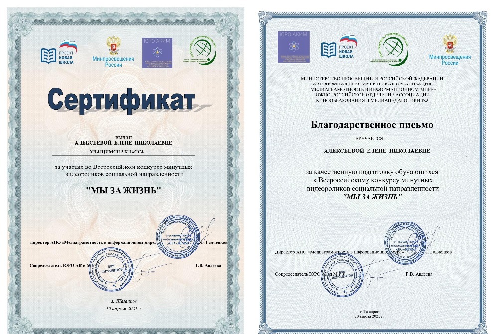Учащиеся 3 класса МБОУ СОШ №11 вместе с классным руководителем Алексеевой Еленой Николаевной приняли участие во Всероссийском конкурсе минутных видеороликов социальной направленности "Мы за жизнь", в номинации "Мы за здоровый образ жизни"