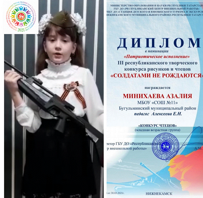 Азалия ученица 3 класса МБОУ СОШ №11 приняла участие в III Республиканском творческом конкурсе рисунков и чтецов "Солдатами не рождаются", номинация "Патриотическое исполнение"