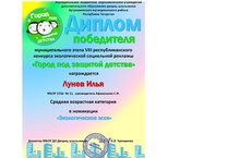 Лунев Илья, ученик 5 класса, стал победителем муниципального этапа VIII Республиканского конкурса экологической социальной рекламы "Город под защитой детства". Руководитель: Афанасьева Светлана Фасхутдиновна