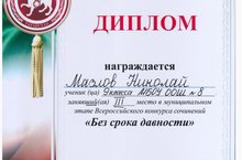 Без срока давности... 19.02.2020Ученик 9 класса Мазлов Николай занял IIIместо в муниципальном этапе Всероссийского конкурса сочинений «Без срока давности», посвящённого 75-летию Победы в Великой Отечественной войне.