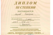 "Жить, помня о корнях своих..." 01.02.2020Ученик 2 класса Марков Дмитрий занял 3 место в VIII Республиканской конференции исследовательских краеведческих работ «Жить, помня о корнях своих…», которая проходила в г. Нижнекамск. Дима и его наставники, Маханько Ольга Николаевна и Храмова Гульнара Рафагатовна, представили работу о военном котелке.