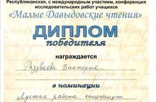 Малые Давыдовские чтения - 2018 16.04.201814 апреля 2018 в «Набережночелнинском государственном педагогическом университете» открылась 10 Республиканская с международным участием научно-практическая конференция учащихся «Малые Давыдовские чтения». Диплом победителя конференции вручён Разуваевой Виктории за лучшую исследовательскую работу. После защиты свей работы Виктория приняла участие в Чемпионате научных исследователей. «Сундук – хранилище истории». Она представила свой проект самому Владимиру Владимировичу Путину, роль которого исполнял ученик гимназии №77 города Набережные Челны. В результате - второй Диплом - за 2 место в Чемпионате.