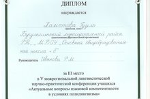 Поздравляем! 24.02.2018Поздравляем ученицу 8 класса Хаметову Гузель(руководитель Иванова Р.М.), занявшую 3 место в V Межрегиональной лингвистической научно-практической конференции учащихся «Актуальные вопросы языковой компетентности в условиях полилингвизма». Гордимся!