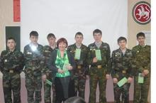 С сентября по март 2012 года проводился Республиканский этап 14 Международного фестиваля "Детство без границ". Кадетская школа-интернат приняла участие в конкурсе "От культуры и спорта к здоровому образу жизни" и заняла почетное третье место. Поздравляем педагога-организатора Шарову Веру Михайловну и зам.директора по воспитательной работе Кириллову Эвелину Петровнус заслуженной победой.