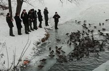 Члены экологического отряда «Землянам о Земле» периодически кормят зимующих уток на городском пруду