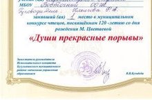 Учащийся нашей школы занял 1 место в муниципальном конкурсе чтецов, посвященный 120-ю со дня рождения М. Цветаевой.