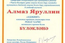 Безнең мәктәпнең йолдызы һәм горурлыгы булган Яруллин Алмазны Р.Харис премиясенә лаек булуы белән котлыйбыз! Аның яңадан -яңа үрләр яулавын, зур уңышларга ирешүен телибез! Әфарин Алмаз!