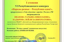 Воспитатели МБДОУ "Детский сад общеразвивающего вида " Аленушка" участвовали в VI Республиканском конкурсе "Народы разные- Республика одна!", приуроченного к Году единства народов России в РФ и получили диплом I степени в номинации "В семье единой (сценическое искусство)".