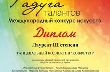 Танцевальный коллектив "КОНФЕТКИ" средняя группа 4 годика участвовали в международном конкурсе искусств "Радуга талантов " под руководством Тазетдиновой Н. Н. и воспитателей Ивановой Т. Н. и Кадыровой Л. Х., где успешно заняли призовое место.
