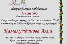 Воспитанница нашего детского сада Камалутдинова А. (воспитатель Тимергалиева В.Х.), награждена Дипломом за 3 место регионального этапа Всероссийского конкурса «Зеленая планета 2018». Поздравляем победителей! Желаем дальнейших побед!
