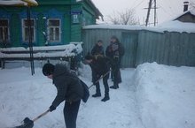 Мальчики 11-х классов во время уборки снега у ветерана войны М. Д. Панцырева -
