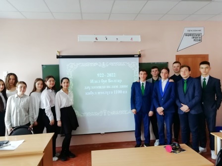 Быел Идел буе Болгар дәүләтендә ислам динен кабул итүгә 1100 ел тула. Шул уңайдан 9а һәм 11 нче сыйныфларда “Болгар тарихи-археологик комплексы - ЮНЕСКО Бөтендөнья мирасы” дип аталган чара үткәрелде. Укучылар Болгар шәһәренең барлыкка килүе, андагы тарихи һәйкәлләр – Җәмигъ мәчете, зур манара, кече манара, кара пулат, ак пулат тарихы турында сөйләштеләр. Бу архитектура биналары белән бәйле легендаларны искә төшерделәр. Болгарда торгызылган яңа тарихи һәйкәлләр белән таныштылар.