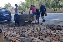 Мальчики пришкольного лагеря "Трудовые резервы" занимались выкладыванием дорожки около школы,где ранее были ямы.
