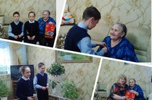 В республиканской акции "Поздравь ветерана" участвуют добровольцы нашей школы. Вместе с главой сельского поселения они посетили труженика тыла. вдову ветерана Захарову Е.Г. Они пообщались с ней, задавали вопросы о жизни во время Великой Отечественной войны. Ребята также рассказали стихи и прикололи Елене Григорьевне георгиевскую ленточку. Она поблагодарила всех за внимание и подарок.