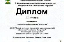 Учащиеся 6б класса лицея-интерната заняли II место Межрегиональном фестиваль- конкурсе " Родной язык- богатство народа", в номинации хореография.