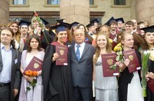 В центре на фотографии - Ректор МГУ В.А. Садовничий, слева от него - наша выпускница Карнышева Элина