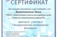 Сертификаты участников 1 Всероссийского инженерного фестиваля получили наши учащиеся Хайбуллов Булат и Крашенинников Эмиль. Их награждает Министерство образования и науки РТ ФГБОУ высшего профессионального образования "КНИТУ им. А.Н.Туполева-КАИ", заместитель Премьер-министра РТ-министр образования и науки РТ Э.Н.Фаттахов и ректор КНИТУ-КАИ А.Х.Гильмутдинов