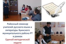 15 февраля 2016 года в рамках Единой методической недели в школе прошел семинар учителей русского языка и литературы Буинского муниципального района РТ на тему «Использование современных образовательных технологий на уроках русского языка в условиях введения ФГОС ООО». Вниманию участников семинара был представлен открытый урок русского языка в 6 классе и мастер - класс на тему “Интерактивные методы обучения как средство формирования ключевых компетенций” , подготовленные учителем русского языка и литературы высшей квалификационной категории Ахмадуллиной Г.Р. Участники семинара отметили высокий уровень организации мероприятия и сошлись во мнении, что единый методический день способствует достижению таких общезначимых целей, как обеспечение единого образовательного пространства, повышения уровня информированности потребителей образовательных услуг, индивидуализации образования и успешности педагогов. 16.02.2016