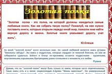 Творческий проект «Золотая полка» был проведен в рамках недели русского языка и литературы. Основные задачи проекта: воспитание уважения к книге как факту общечеловеческой культуры; включение чтения в структуру приоритетных культурных потребностей учащихся; расширение взаимодействия ребят со школьной библиотекой; содействие созданию модели образовательного пространства, обеспечивающего совместную читательскую деятельность детей, педагогов и родителей на основе общего интереса к книге; расширение кругозора, повышение общего уровня эрудированности. В творческих проектах активное участие приняли учащиеся 6-9 классов. 09.12.2015