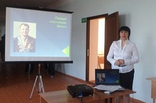 Физика укытучысы Гарипова С.И. Җирнең беренче космонавты турында сөйләде. Ахырдан Юрий Алексеевич Гагарин турында фильм күрсәтелде.