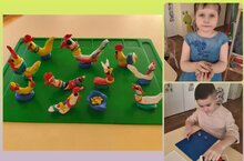 Воспитанники подготовительной к школе группы в рамках тематической недели "Город мастеров" продолжают знакомиться народными промыслами. Сегодня на занятии по художественно- эстетическому развитию дети познакомились с дымковскими игрушками. Ребята слепили дымковского петушка, украсили его характерными узорами.