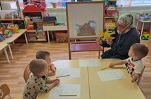 На занятии по художественно-эстетическому развитию (рисование) воспитанники второй группы раннего возраста знакомились с желтым карандашом и фломастером. Они учились рисовать солнышко с лучиками, которое светит над домиком.