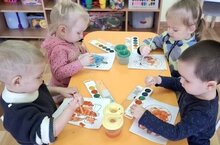 «Вот какие птички!» — с такими радостными возгласами сегодня прошло занятие по художественно-эстетическому развитию (рисование) в первой младшей группе. К малышам в гости «прилетели» красногрудые снегири, но необычные — ребята создавали их с помощью своих ладошек!Процесс захватил каждого ребенка: окунали ладошки в яркую красную краску и ставили отпечатки на бумаге. Затем, с помощью воспитателя, отпечатки превратились в настоящих птиц — добавили им глазки, клювики и хвостики.Такое «пальчиковое» творчество не только дарит малышам массу положительных эмоций, но и помогает им запомнить названия птиц и закрепить знания о красном цвете. Посмотрите, какая яркая стайка снегирей теперь украшает раздевалку.
