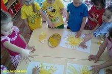 В средней группе дети рисовали «Любимое солнышко» нетрадиционным методом без кисточки с помощью своих ладошек. Процесс работы доставил детям удовольствие. Они очень эмоционально реагировали на свои отпечатки. Такая техника помогает снять страх перед работой с красками, развивает мелкую моторику, уверенность в себе, чувство цвета, учит понимать характер красок и выражать с их помощью свое настроение. Дети остались довольны работой. (воспитатель Муллагалиева Г.М.)