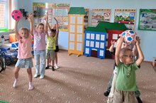 В рамках тематического дня "Подвижные игры с мячом", воспитанники подготовительной группы разбившись на две команды соревновались в ловкости игр с мячом.