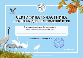 Обучающиеся объединения «Живая планета» МБУ ДО «ЦВР г. Буинска РТ»-педагог Степанов В.А. приняли активное участие во Всемирных днях наблюдений птиц и получили сертификат участника.